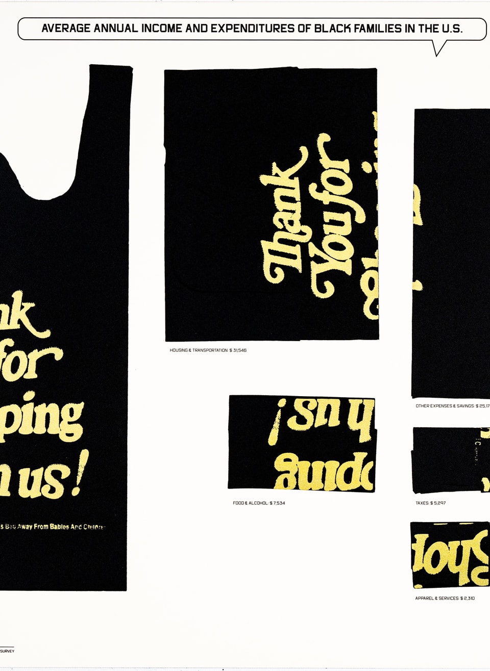 “Average Annual Income and Expenditures of Black Families in the U.S.” is an update of one of Du Bois’s most iconic data portraits which was illuminated by beautiful photographs of Black families and a gold “one dollar” coin. We decided to take a national average given that the data exists now. Without this data, Du Bois focused on Georgia using surveys taken door to door. As we look at the 21st century, how Black families divide their income has changed along familiar lines. We see that housing is taking up the greater portion of their income and there is an increased investment in what Du Bois termed, “the higher life,” things such as savings, education and healthcare. As the plastic shopping bag comes to an end in many towns we celebrate the gold and black ones. A sign of financial means in many places, the humble plastic bag is an iconic part of history deserving its rightful as Pop Art.