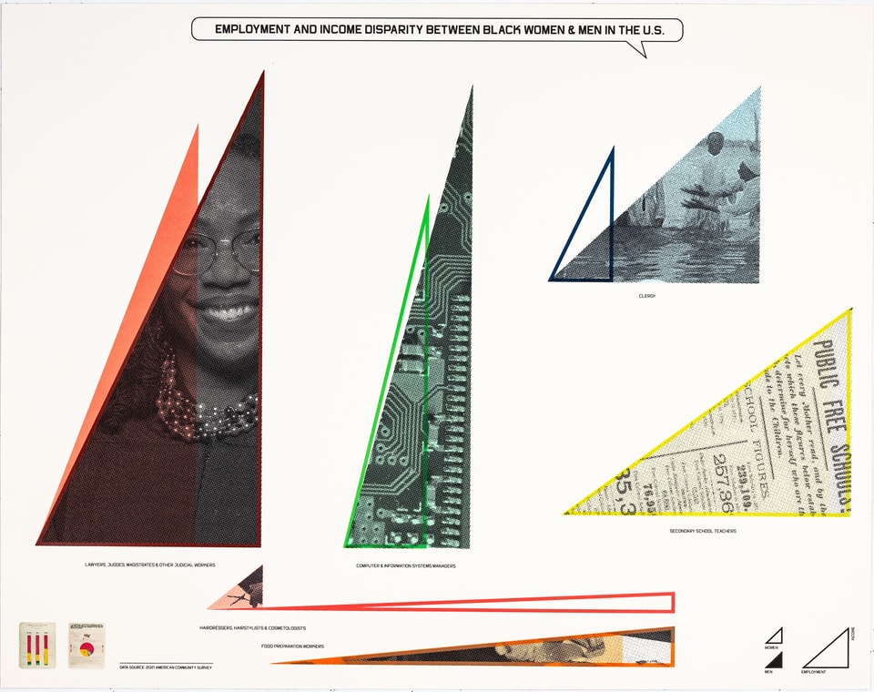 “Employment and Income Disparities Between Black Women & Men in the U.S.” shows the income to employment disparities in six professional fields. Since 1900, there have been considerable strides in Black employment particularly in an expansion of possibilities for employment. However small in number, Black people are working across the spectrum of occupations. Even so, it is no surprise that Black unemployment remains relatively high compared to that of other races. Here we decided to focus on Black men and women for a more intimate story in the larger employment story through a series of triangles. The length of each base represents employment while the high of the triangles represent income. Women are represented by a colorful outline and men are represented by a colored fill. The photographic images do not represent data, yet illustrate each occupational category. When we compare these disparities between Black men and women we see interesting trends where one gender may outpace the other within a given field. Some of these are surprising such as the relatively small amount of men hairstylists compared to women make almost double the income or how women outpace men in income and employment in the field of layer, judges, magistrates and other judicial workers.