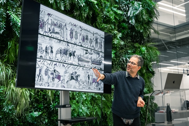 David Samuel Stern, MFA ‘06, conducted studio reviews with MFA-VA students during his trip to campus to mark the unveiling of his Weil Project Wall piece, Unknown (American), 2023.