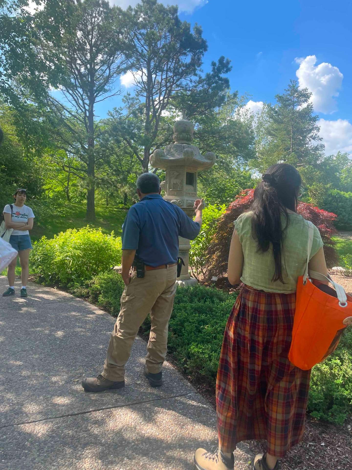 Ben Chu explaining landscape architect Koichi Kawana’s vision for the Japanese Garden (est. 1973): “to give expression to the Japanese character.” The garden, built with funds raised by the local Japanese Americans Citizens League, was conceived as a gift to the city of St. Louis, expressing gratitude for the “warm welcome” extended to Japanese Americans during and after WWII.
