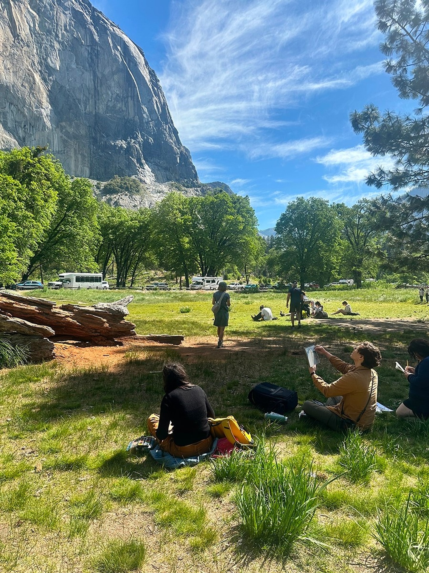 Students sketching at Yosemite National Park. Working from the same vantage points as Chiura Obata, students drew Half Dome and El Capitan while studying Obata’s paintings and writings on nature and creativity. The exercise connected direct observation with Obata’s artistic philosophy and his experience of the American landscape as a Japanese immigrant artist and educator.