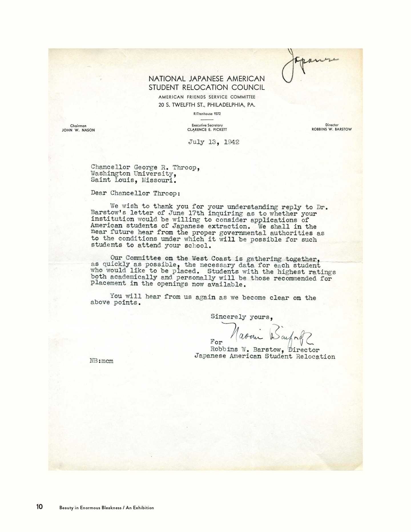 Letter from the Japanese American Student Relocation Council to Chancellor Throop, 1942. Courtesy of the Julian Edison Department of Special Collections, Washington University Libraries.