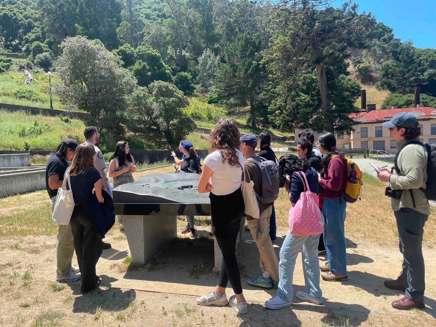 Students listening to the guide at Angel Island as he describes the design concept for the now-deteriorated granite memorial (featuring immigration-related inscriptions) to the those incarcerated on the site (the maquette is in the foreground, and the memorial is located at left).
